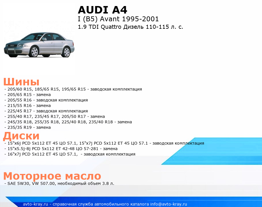A4 1.9 TDI Quattro Дизель 110-115 л. с.