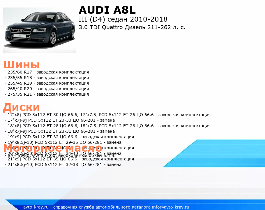 A8L 3.0 TDI Quattro Дизель 211-262 л. с.